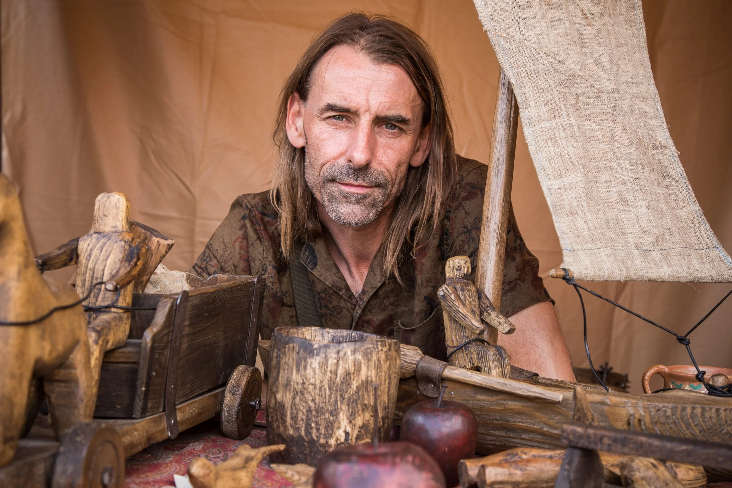 Z kolei swoje „nie-zabawki” zaprezentuje Piotr Rogaliński – artysta, który tworzy rzeźby z przesłaniem. Niewielkie instalacje i artefakty powstające ze starego, niepotrzebnego drewna (belek, fragmentów narzędzi), a umieszczone w nowych kontekstach, poruszają istotne ludzkie sprawy: trud życia codziennego, intymny kontakt z drugą osobą, miłość, a także samotność i śmierć. Swoją surowością „nie-zabawki” przypominają archaiczne przedmioty, kontrastujące ze współczesnym światem pełnym koloru. Jak co roku na Jarmark Jagielloński zawitają też budowniczowie instrumentów drewnianych. Dmytro Bereziuk z Łucka, kontynuujący wielopokoleniowe rodzinne tradycje, zaprezentuje ukraińskie sopiłki, dudy, wołyńskie rogi, liry korbowe i tylynki/telenki. Te ostatnie to prymitywne odmiany fletów bez otworów palcowych, w których wysokość dźwięku zmienia się poprzez włożenie palca do otwartego końca piszczałki. Każdy, kto odwiedzi stoisko tego artysty, będzie mógł usłyszeć wiele opowieści na temat każdego instrumentu, poznać jego brzmienie i zasady gry. Liry korbowe o niepowtarzalnych kształtach zademonstruje też inny twórca z Ukrainy – Gordiy Starukh. Na jego stoisku będzie można usłyszeć tradycyjne melodie ukraińskie i spróbować gry na tym niezwykłym instrumencie. Prostotą swoich kształtów i urzekającą kolorystyką przyciągną (nie tylko najmłodszych) ludowe zabawki. Przy stoisku Piotra Mentla, twórcy ludowego ze Stryszawy, będzie można zobaczyć, jak powstają małe, drewniane ptaszki. Uczestnicy Festiwalu poznają też charakterystyczne zabawki z jaworowskiego ośrodka zabawkarskiego, którego tradycje kontynuują Oksana Kohut i Ostap Soika. Klepaki trzepoczące skrzydłami, karuzelki, dziobiące kurki, koniki, pukawki, taczki i inne kolorowe cudeńka z drewna będzie można zobaczyć oraz zakupić od Karola i Józefa Lasików ze Stryszawy, Ryszarda Marcińca z Brzózy Stadnickiej, a także Wiesławy i Mariana Łobozów z Pewli Wielkiej.
